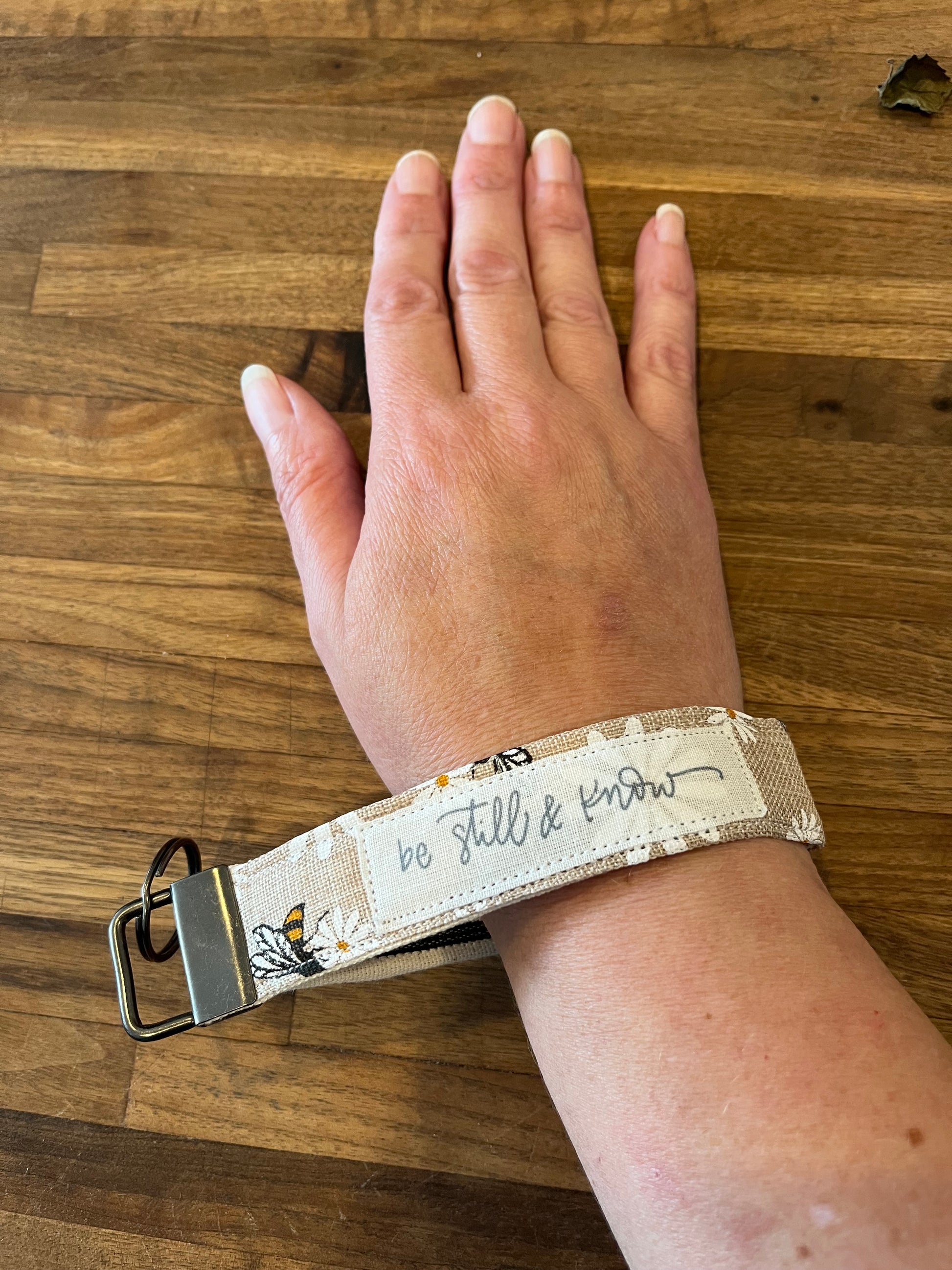 Hand-lettered text of your choice atop pretty fabric fits around your wrist. Inside of wristlet is finished in a coordinating stripe, print, or solid. Stitched from 11x2” pieces of fabric, about 1” wide when finished. Wristlet has fusible batting on the inside for cushion. Ready for pickup or shipping in 7-10 days.